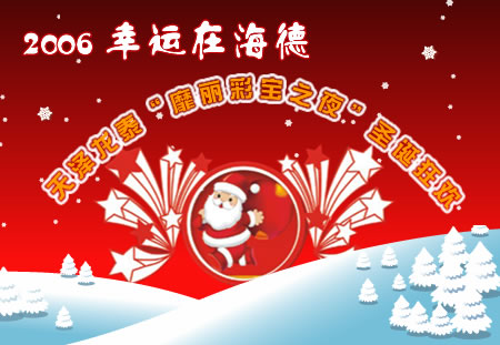 伴着皑皑的大雪,那个童话般的节日--圣诞节已悄悄走来。冬日的海德包头酒店,处处洋溢着圣诞节的欢乐气氛。翌年一度的圣诞狂欢夜又要到来了,你参加过激情狂欢、惊喜不断的圣诞节吗?你想体验现场参加“开心辞典”的气氛吗?你想实现自己的家庭梦想吗?最高价值10000元的奖品等你拿!赶快行动吧!加入到海德包头酒店2006年的圣诞风暴中!